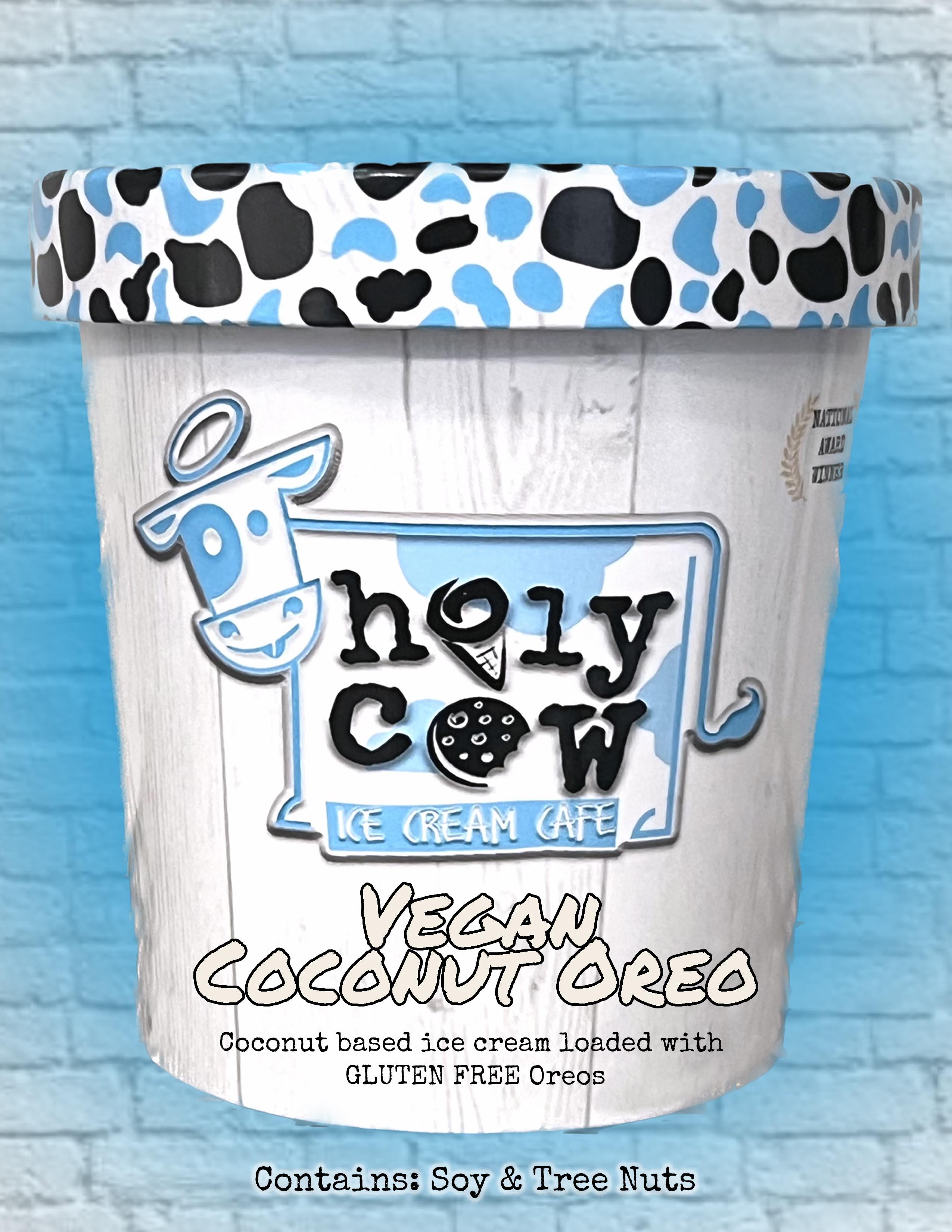 Coconut based ice cream loaded with GLUTEN FREE Oreos Contains: Coconut & Soy