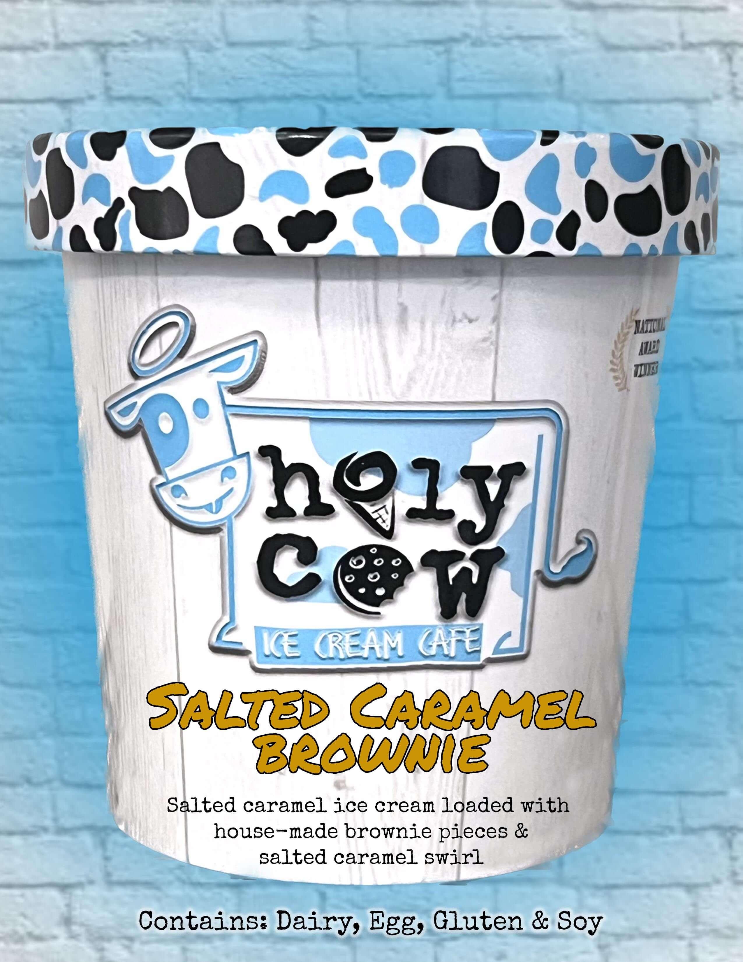 Salted caramel ice cream loaded with house-made brownie pieces & salted caramel swirl Contains: Dairy, Egg, Gluten & Soy
