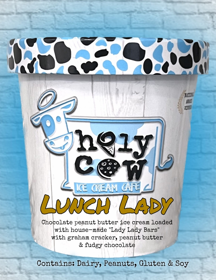 Chocolate peanut butter ice cream loaded with house-made "Lunch Lady Bars" consisting of graham cracker, peanut butter and fudgy chocolate Contains: Dairy, Peanuts, Gluten, & Soy