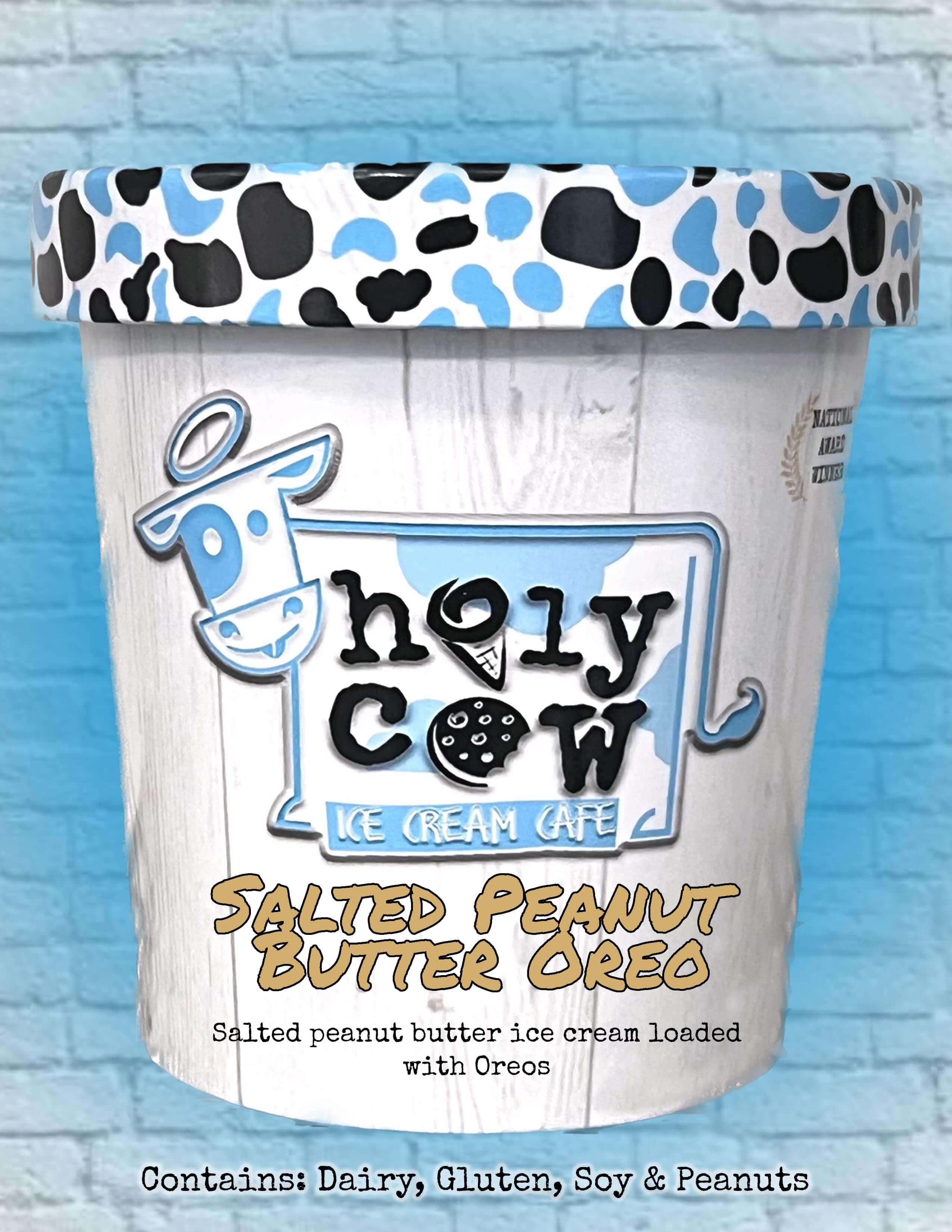 Salted Peanut Butter ice cream loaded with Oreos & peanut butter swirl Contains: Dairy, Gluten, Peanuts & Soy