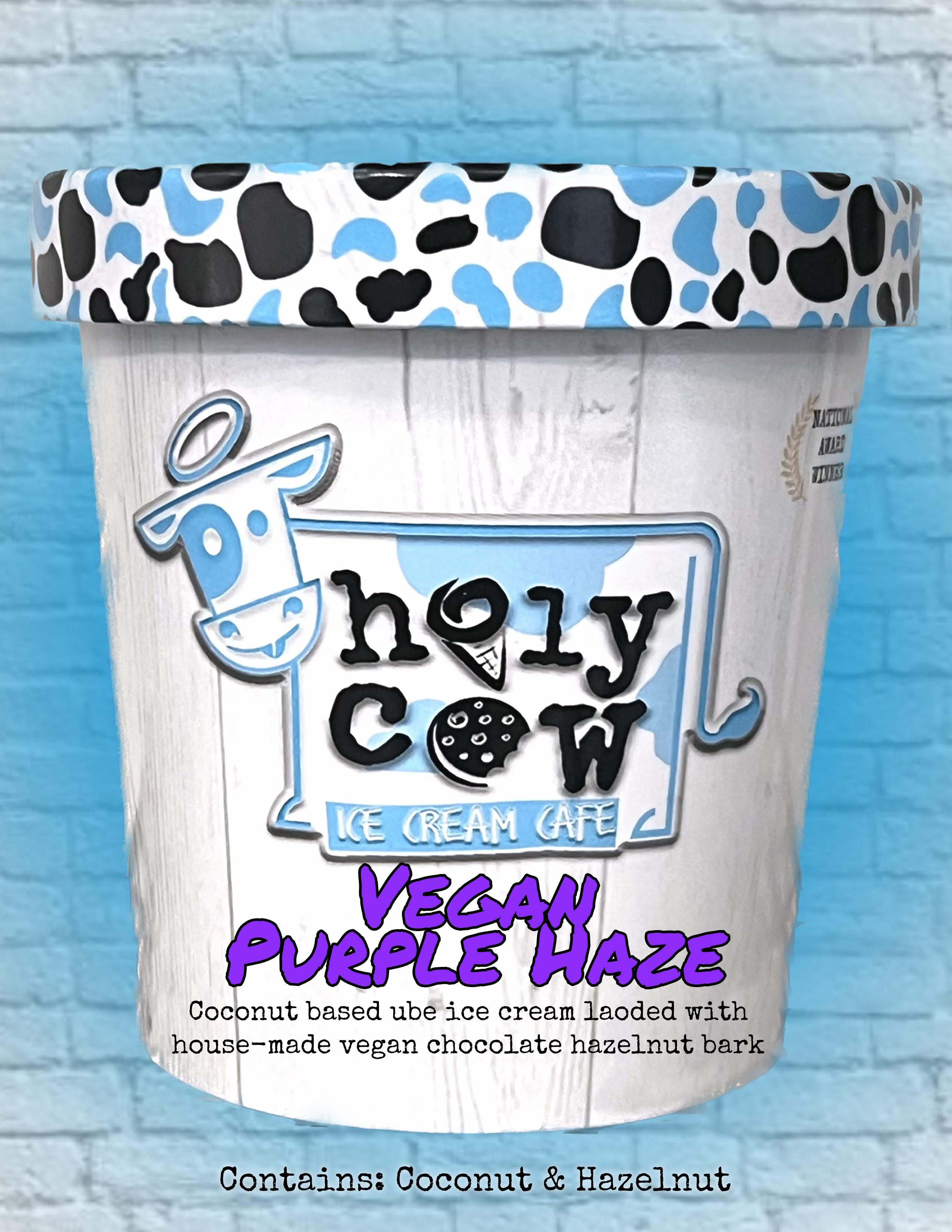 Coconut based Ube ice cream loaded with house-made vegan chocolate hazelnut bark Contains: Coconut & Hazelnut
